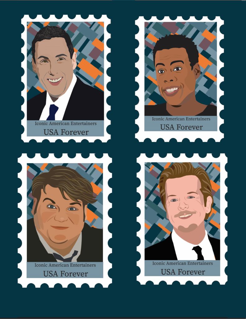 For this project we were asked to create four postage stamps of our favorite iconic American entertainers. Considering my love of comedy and all things funny my immediate first choice was Adam Sandler and the project’s subject matter quickly turned into a set of postage stamps of Adam Sandler and his iconic friends that he regularly performs with.